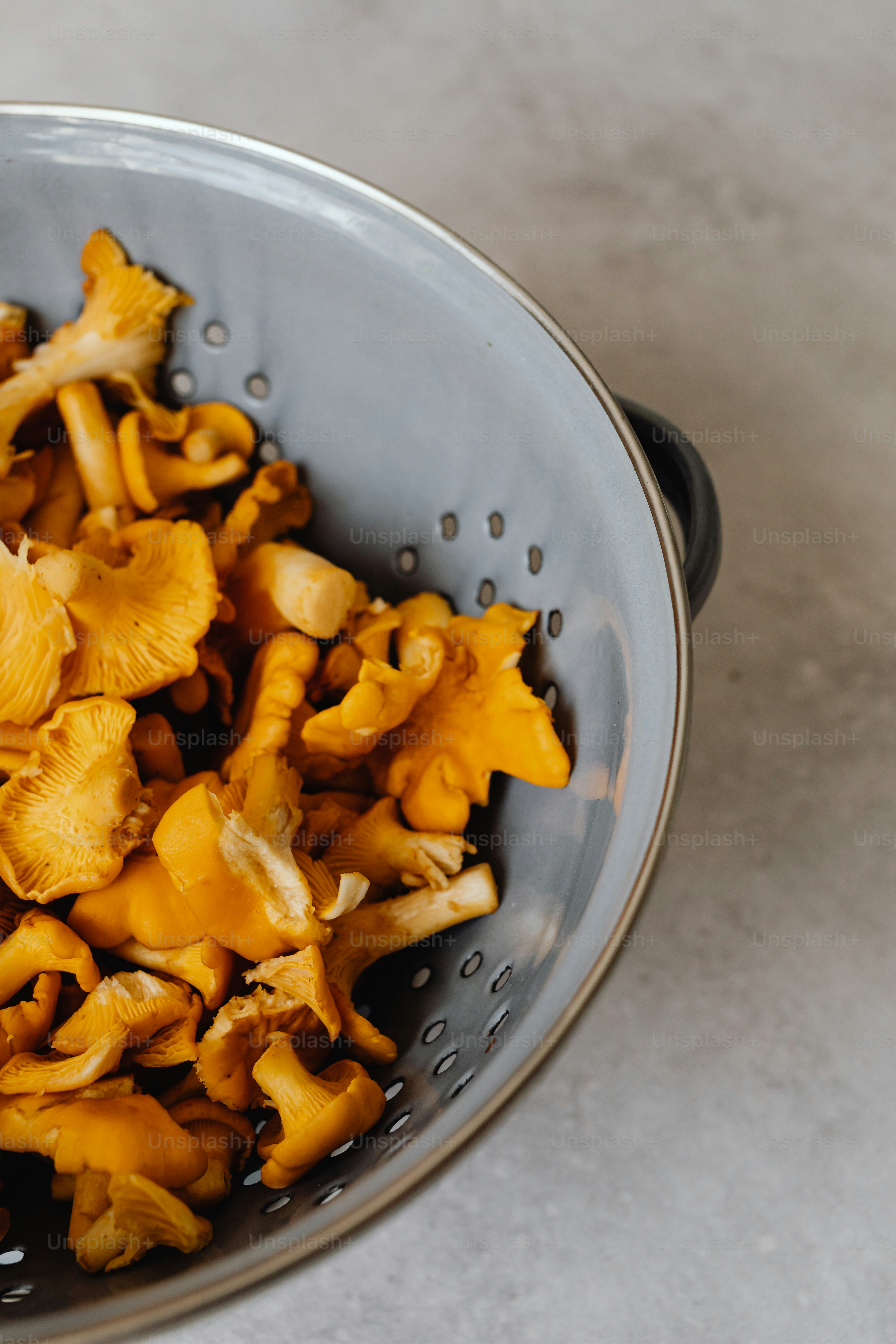 Fresh chanterelle mushrooms in a gray colander photo – Mushrooms Image ...