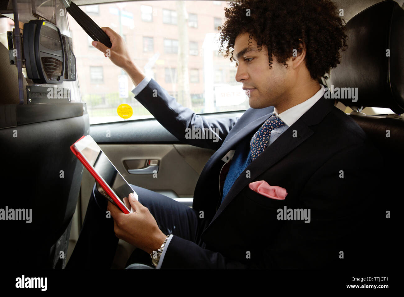 Using a tablet computer driving a modern car Stock Photo - Alamy