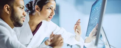 Molecular modeling in drug discovery with scientists analyzing on a ...