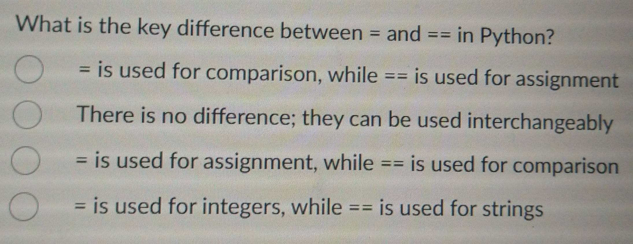 Solved: What is the key difference between =and== in Python? = is used ...