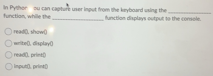 Solved: In Python ou can capture user input from the keyboard using the ...