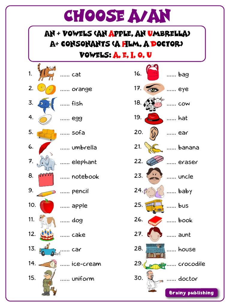 Choose A/an: An + Vowels (An Pple, An Mbrella) A+ Consonants (A Ilm, A ...