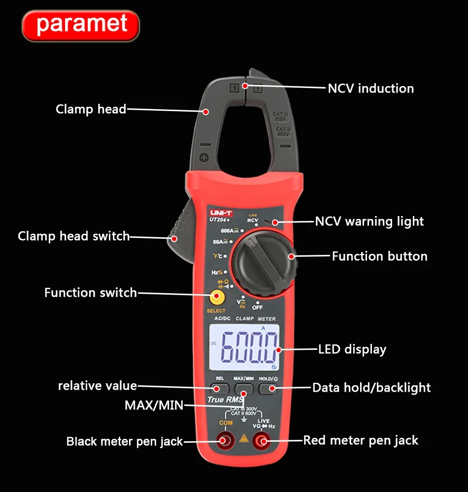 UNI-T UT204+ 6000 Counts Digital Clamp Meter True RMS Multimeter Clamp ...