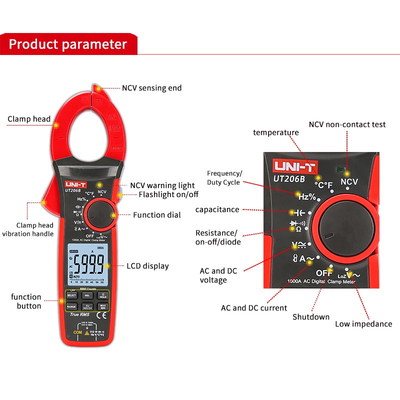 UNI-T UT206B True RMS Digital Clamp Meter AC DC Current 1000A 1000V ...