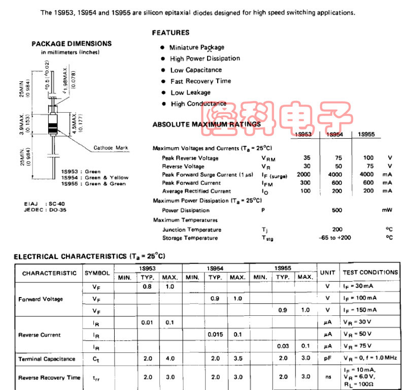 1S954-T4-AZ高速开关二极管IS954绿环黄环色环直插原装进口 50V_虎窝淘