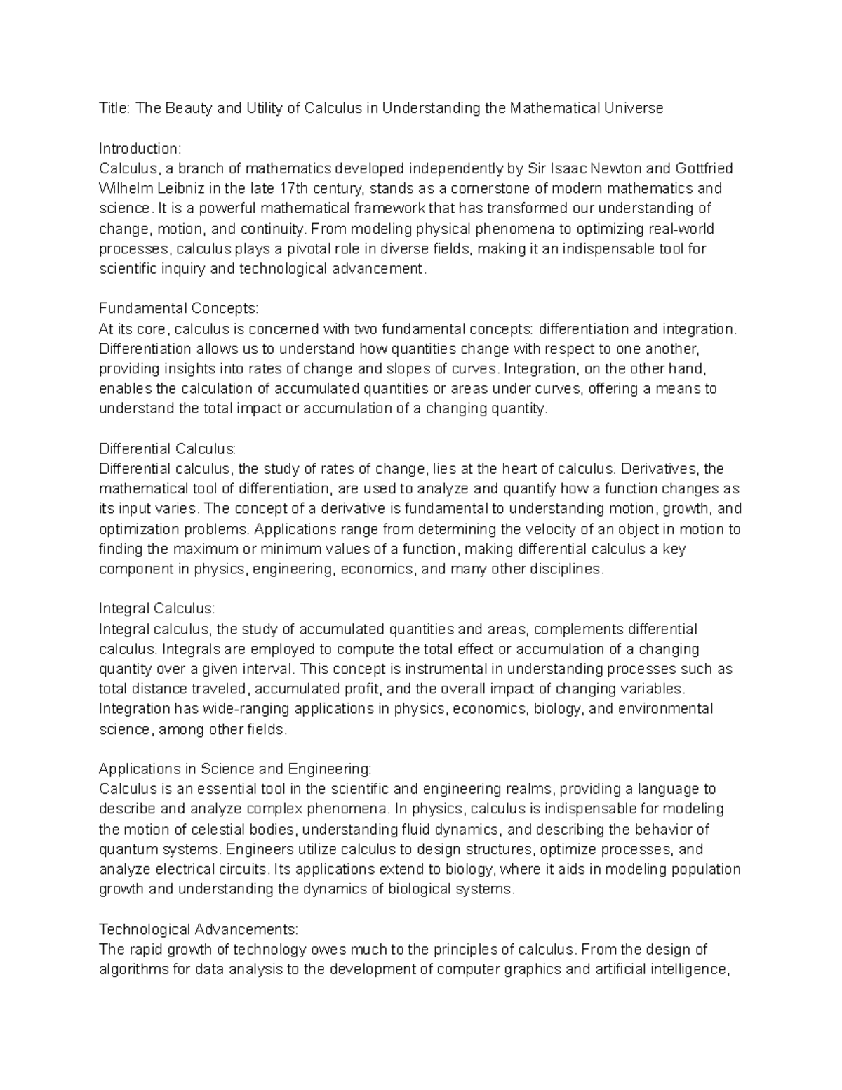 Title The Beauty and Utility of Calculus in Understanding the ...