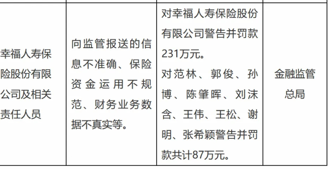 涉保险资金运用不规范等违规行为,幸福人寿被罚款231万元_腾讯新闻