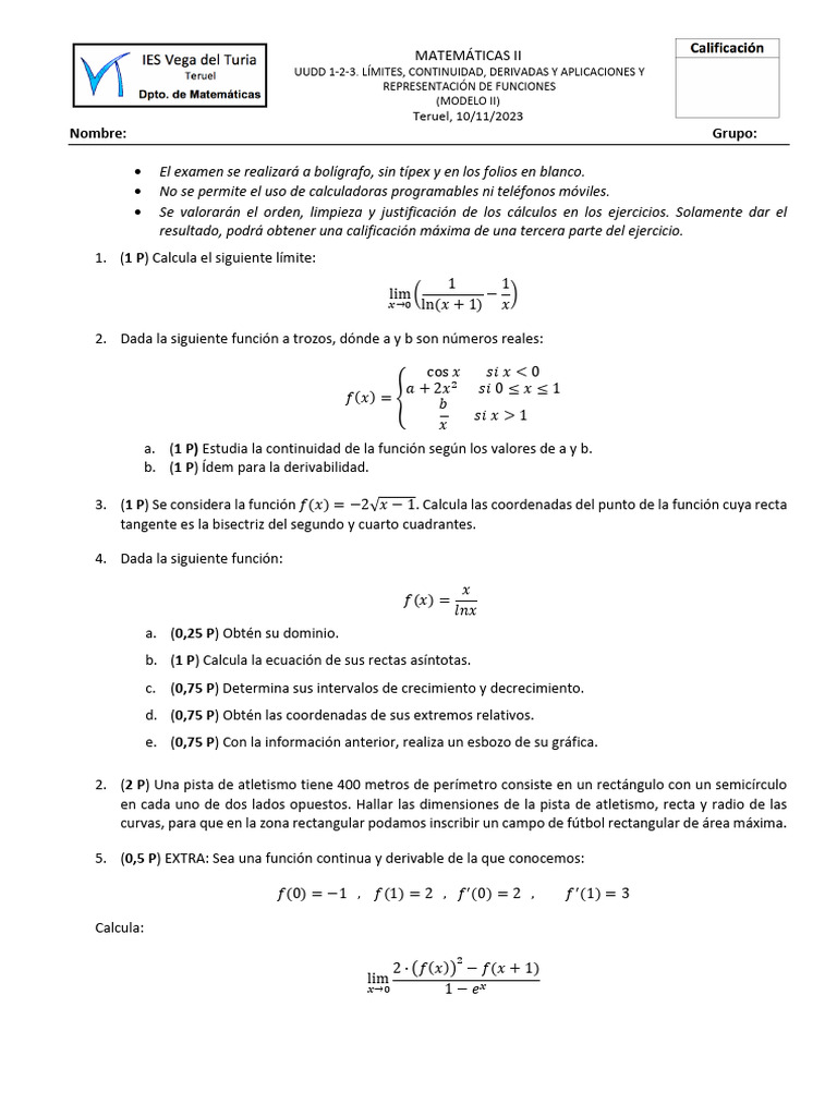 Examen Uudd 1-2-3. Límites, Derivadas y Funciones II | PDF | Función ...