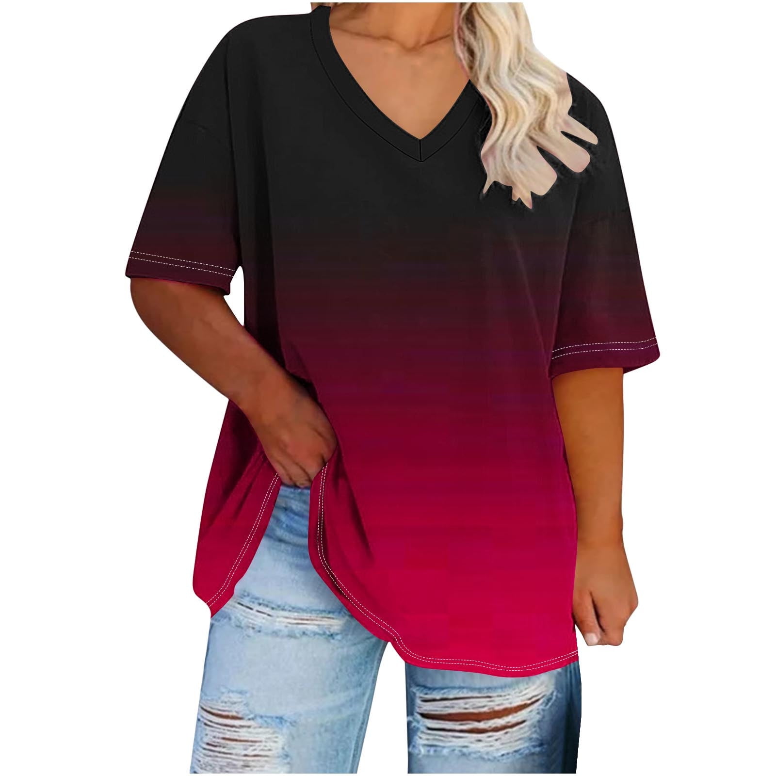 Annhoo Womens Plus Size V Neck Shirt Fashion Gradient Color Short ...