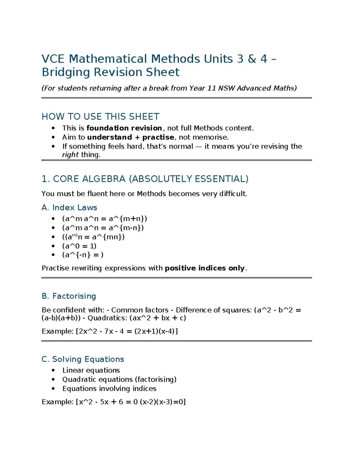 VCE Mathematical Methods 3 & 4 Bridging Revision Guide - Studocu