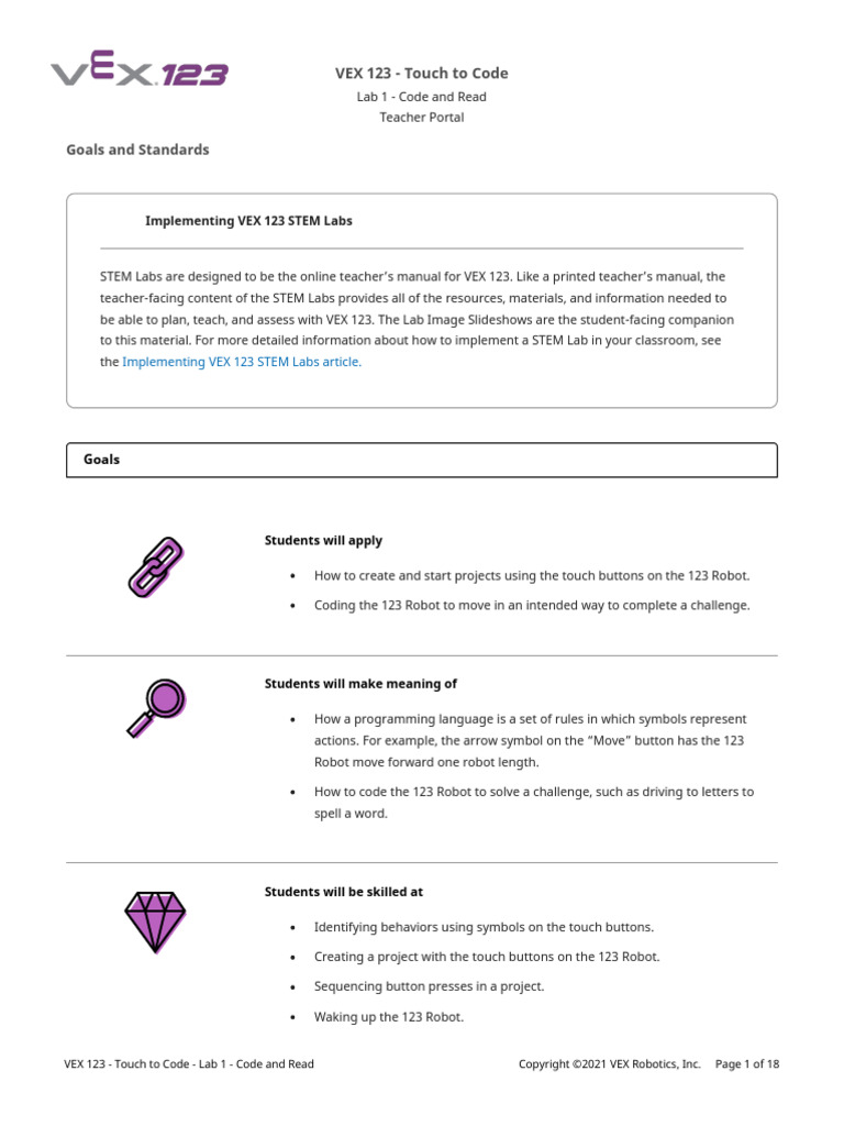 Vex 123 Touch To Code Lab 1 Code and Read | PDF | Robot | Robotics