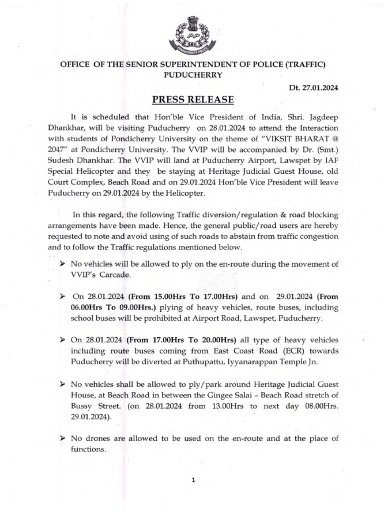 Press Note - VVIP Visit - Traffic Regulations, Dt. 27.01.2024 | PDF