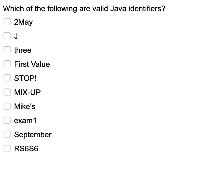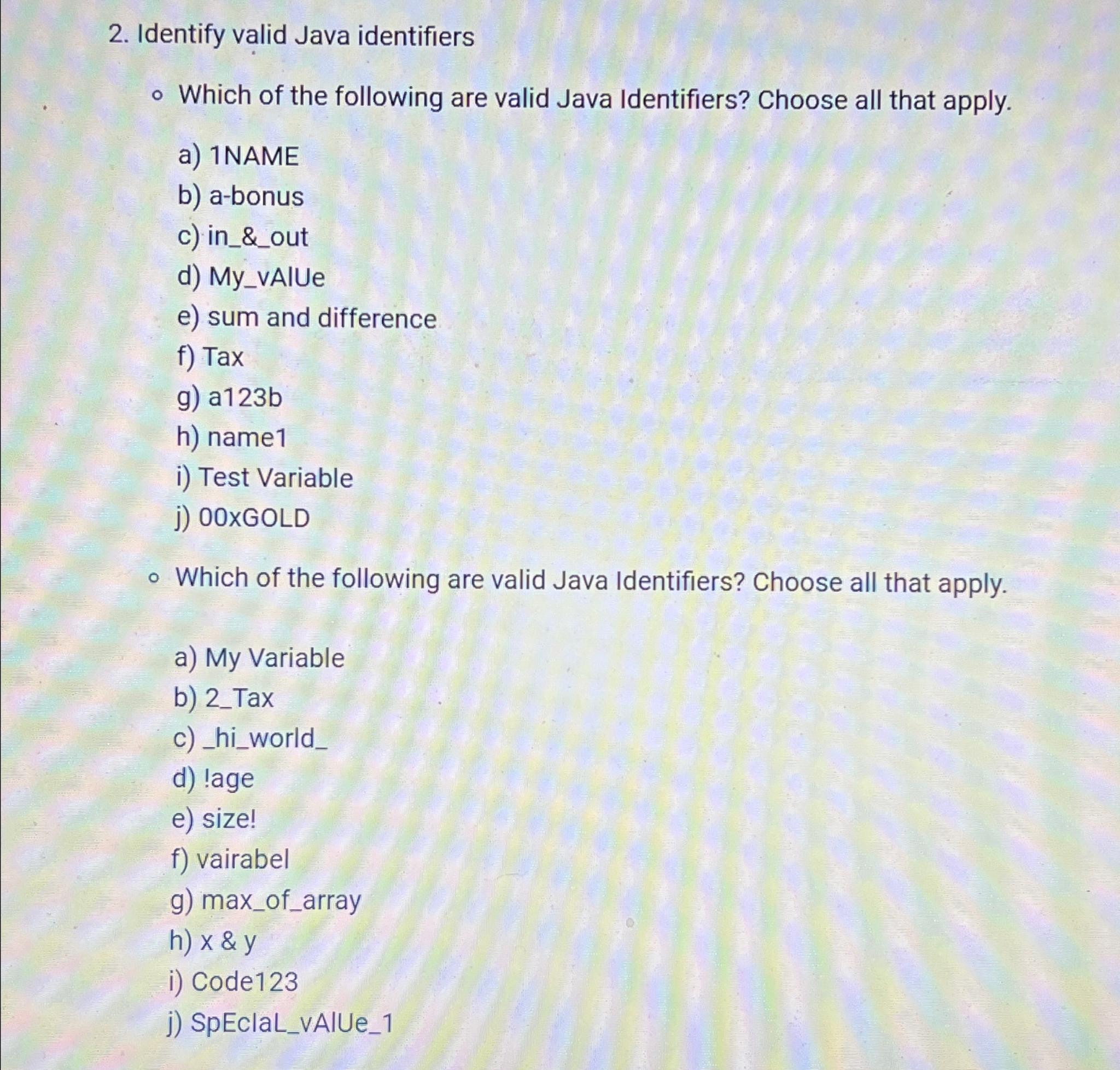 Solved - Which of the following are valid Java Identifiers? | Chegg.com