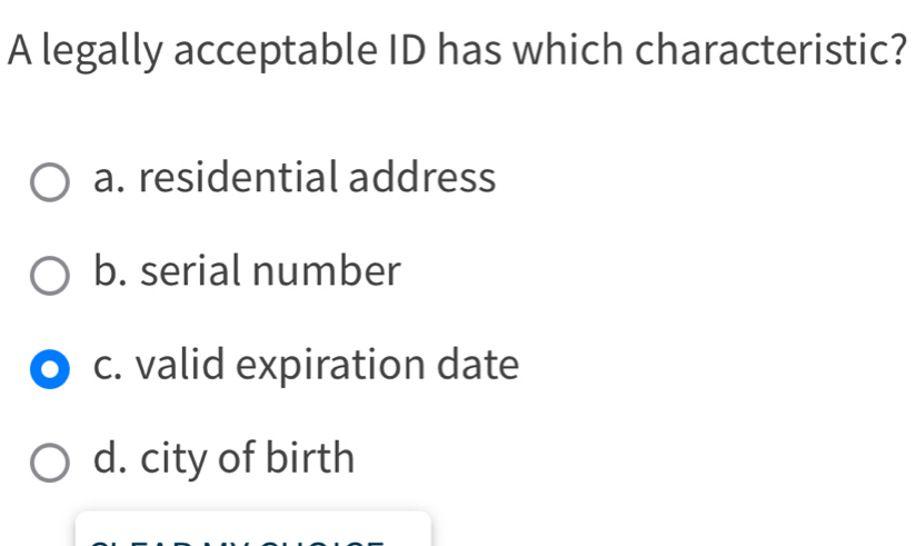 Solved: A legally acceptable ID has which characteristic? a. serial ...