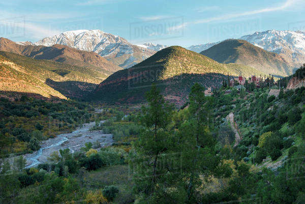 Landscape of mountains and a river flowing through the valley - Stock ...
