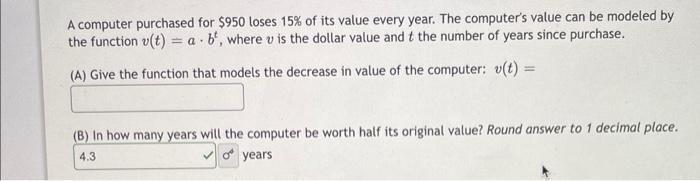 Solved A computer purchased for $950 loses 15% of its value | Chegg.com