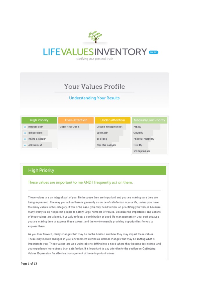 Your-Values-Profile Session-1 my.LifeValuesInventory.org - Your Values ...