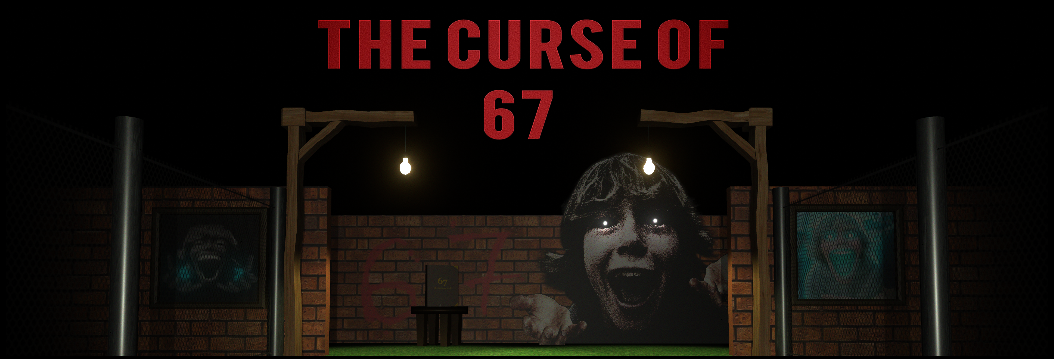 The number 67 rendered in neon blue and pink lights against a dark ...