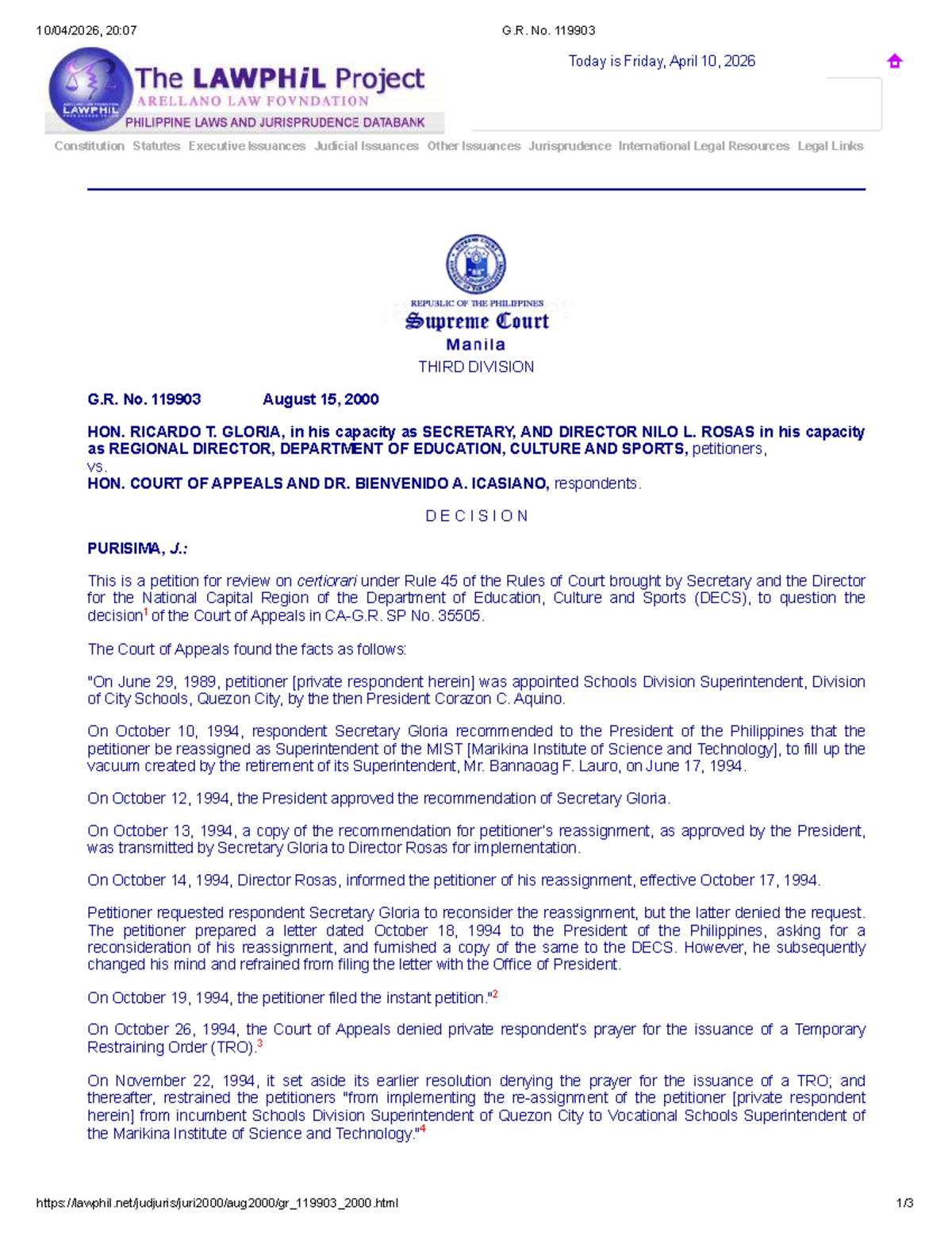 G.R. No. 119903: Gloria vs. CA - Decision on Reassignment Case - Studocu