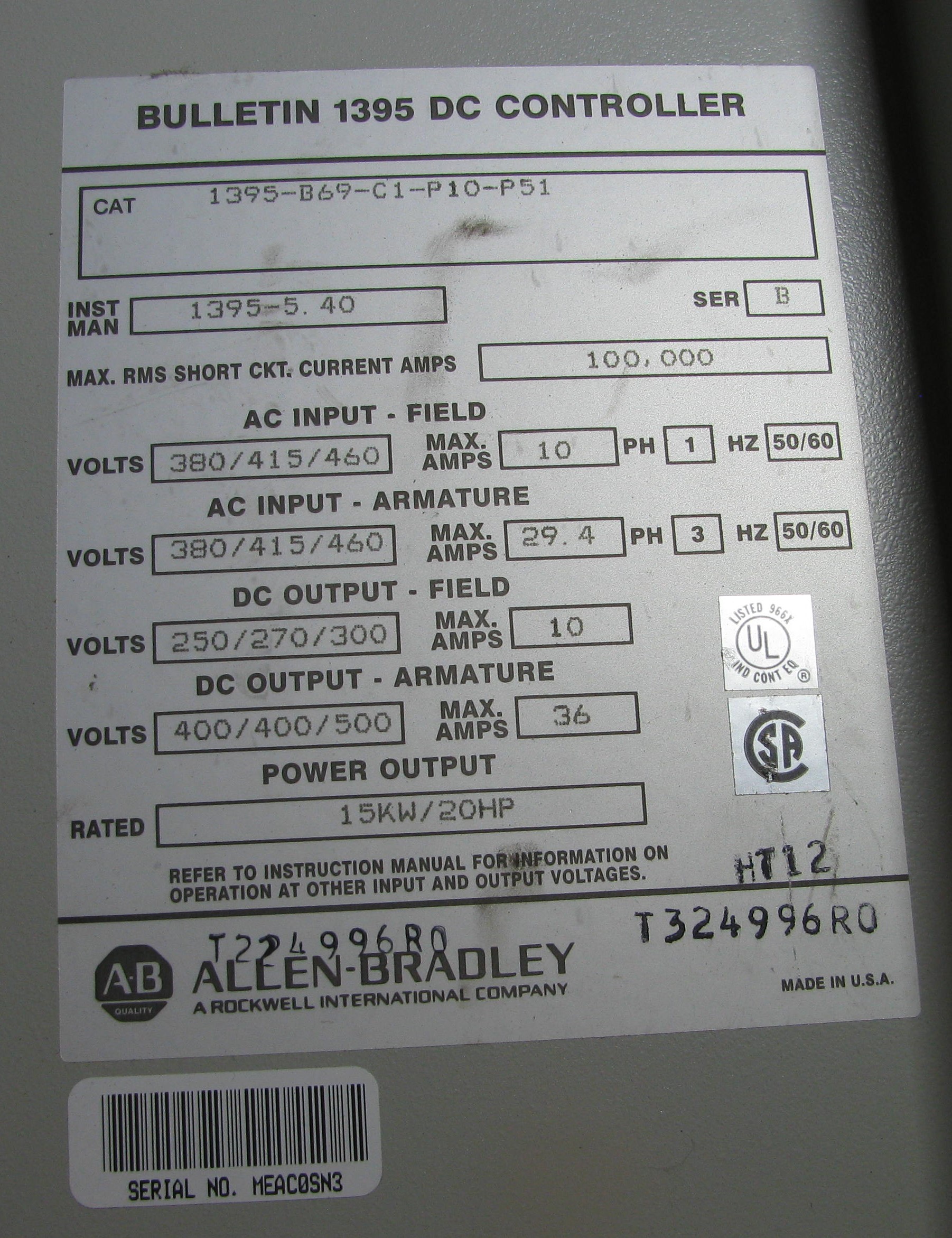 20HP ALLEN BRADLEY 1395-B69-D1-P10-P51 VARIABLE VOLTAGE MODULE