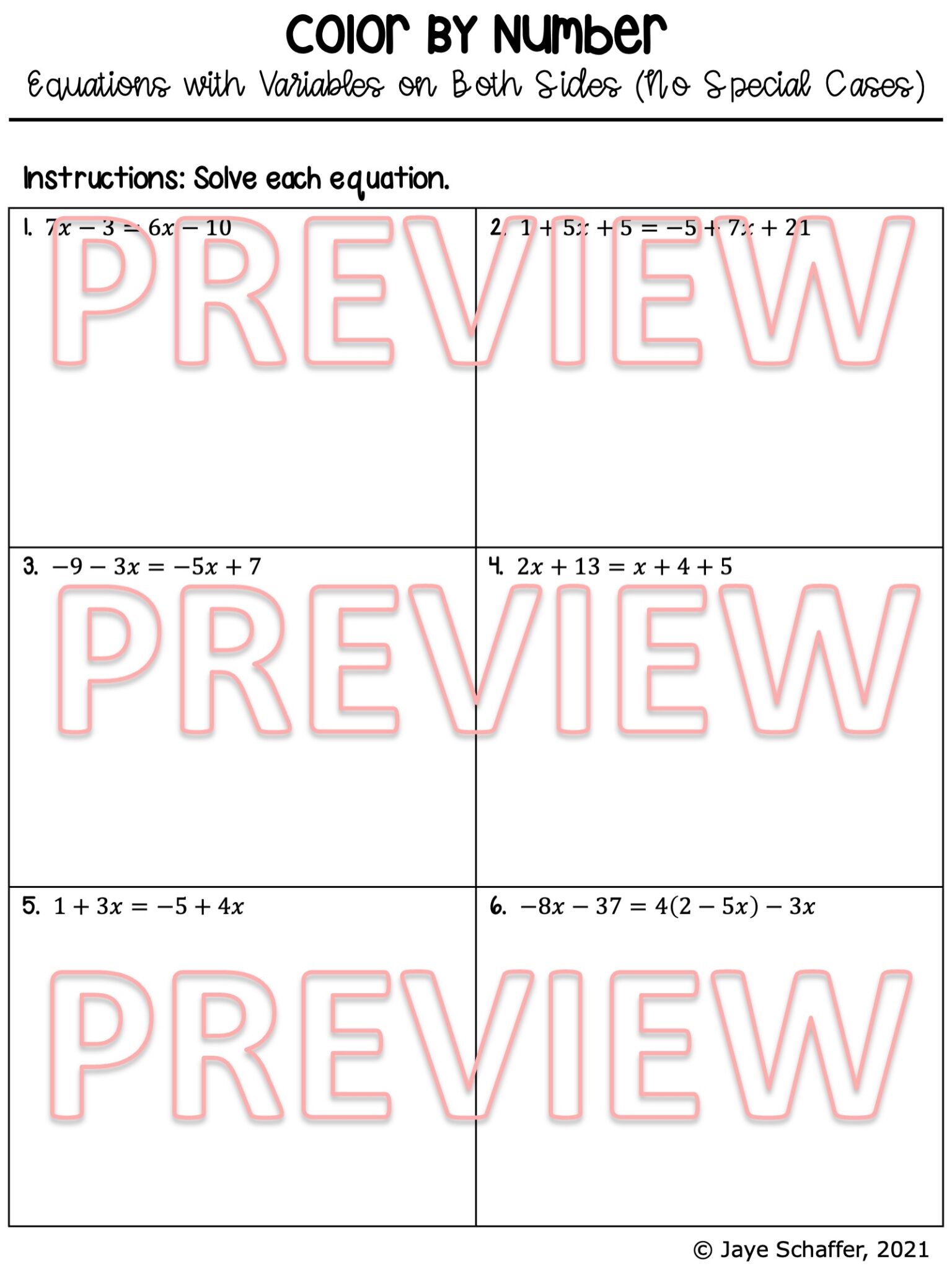 Solving Equations with Variables on Both Sides Coloring Sheet | Pre ...