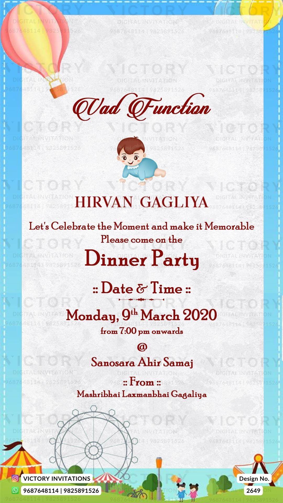Vad Ceremony invitation card in english language with doodle as balloo ...