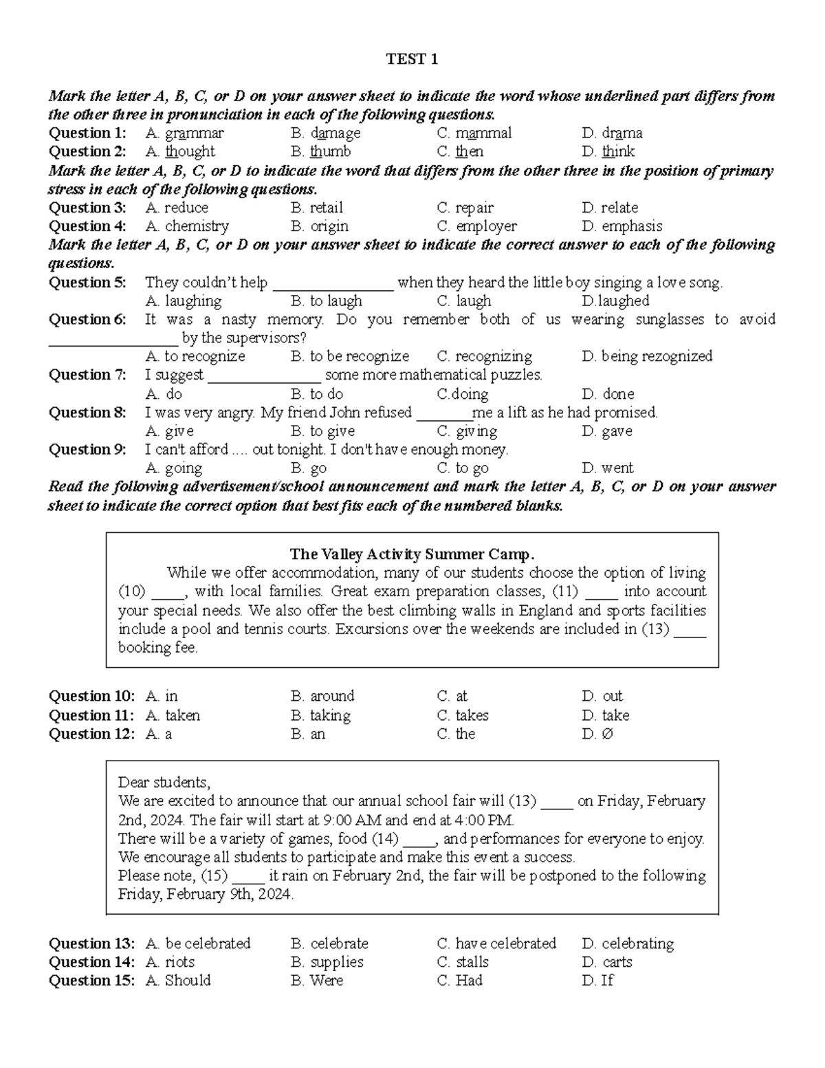 Test 1 - Vocabulary and Reading Comprehension Evaluation - Studocu