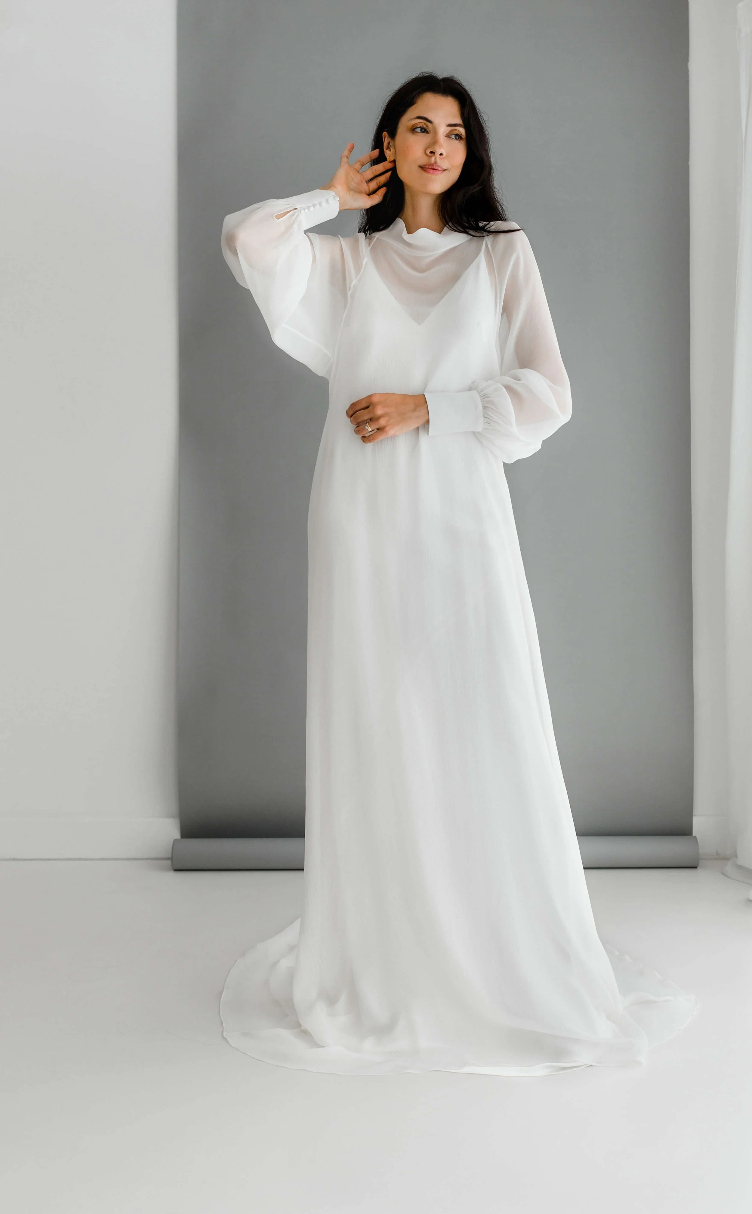 Modern minimalist long sleeve sheer bridal layering over dress ...