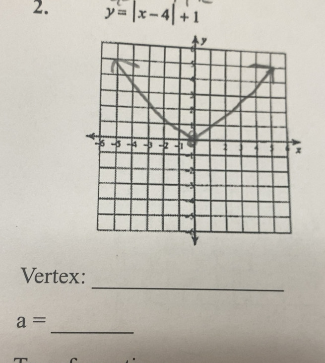 Solved: y=|x-4|+1 _ Vertex: _ a= [Math]