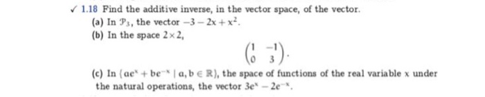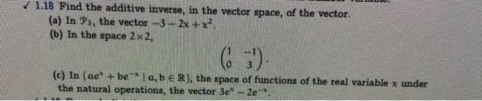 Solved 1.18 Find the additive inverse, in the vector space, | Chegg.com