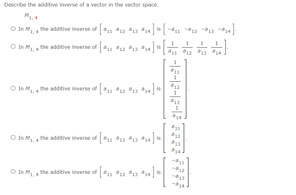 SOLVED:Describe the additive inverse of a vector in the vector space. R^4