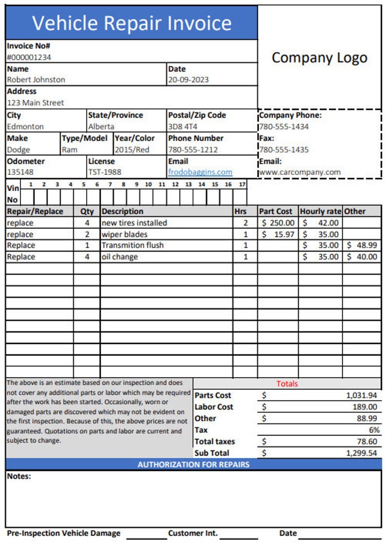 Free Auto Repair Invoice Template. Customize and Send in 90 Seconds