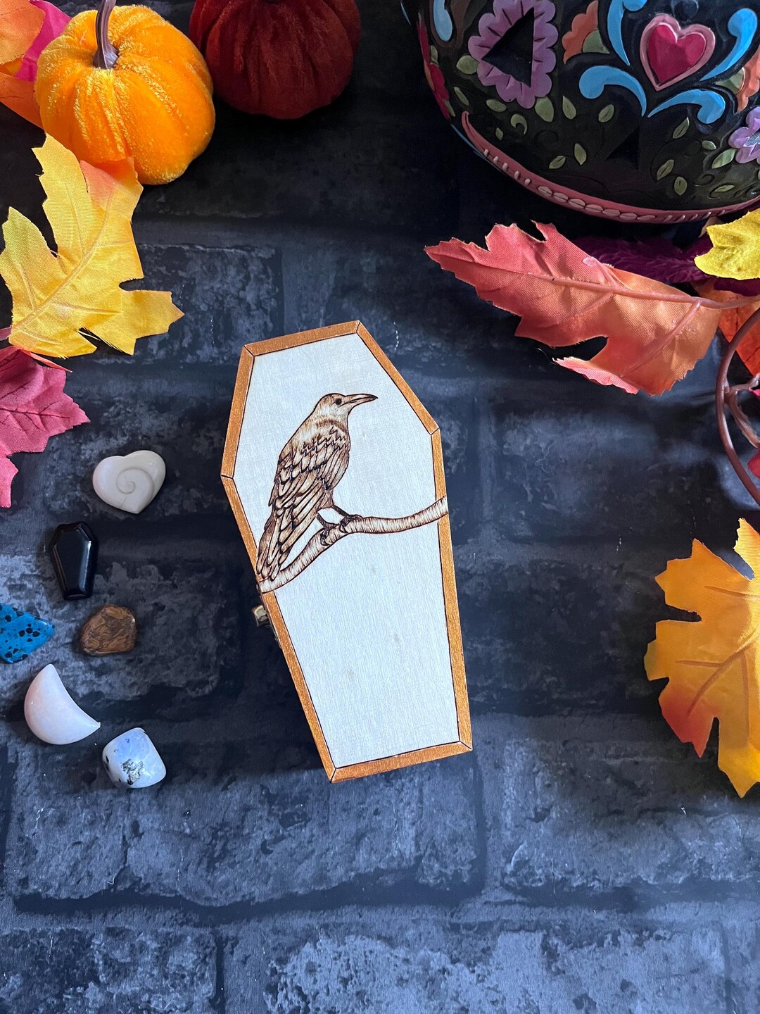 Crow Design Pyrography Coffin Shaped Velvet Lined Box - Etsy