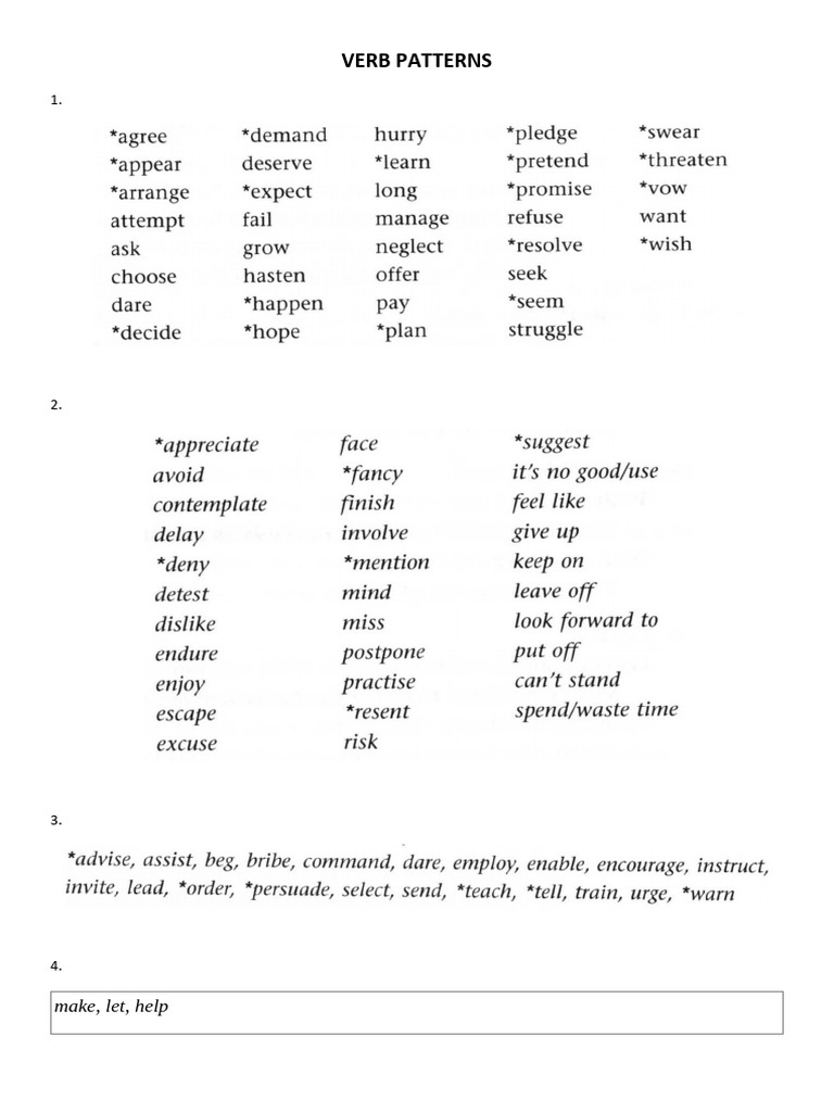 Verb patterns. Verbs followed by -ing forms or to+ infinitive online ...