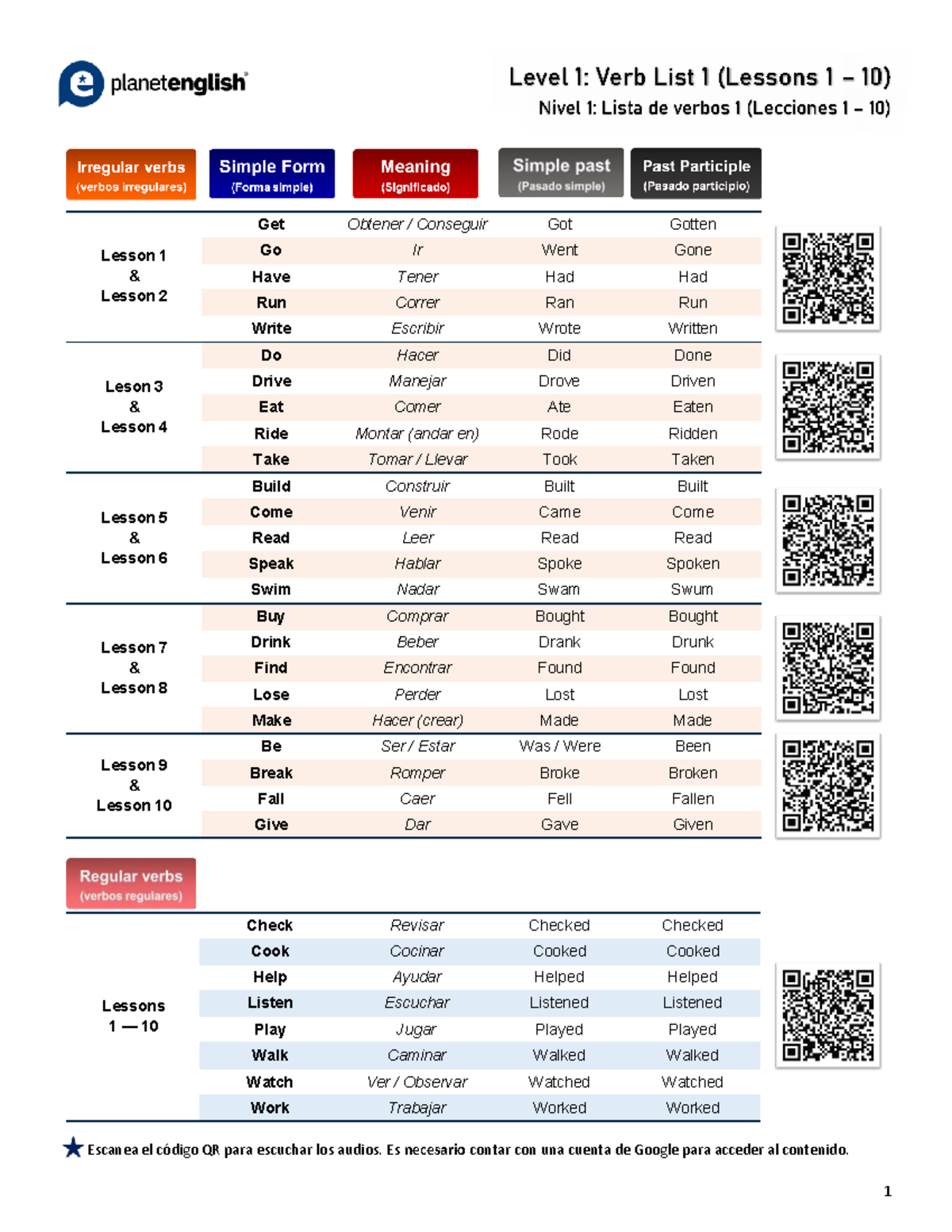 Level 1: Verb List 1 (Lessons 1-10) - Lista de Verbos 1 (Lecciones 1-10 ...