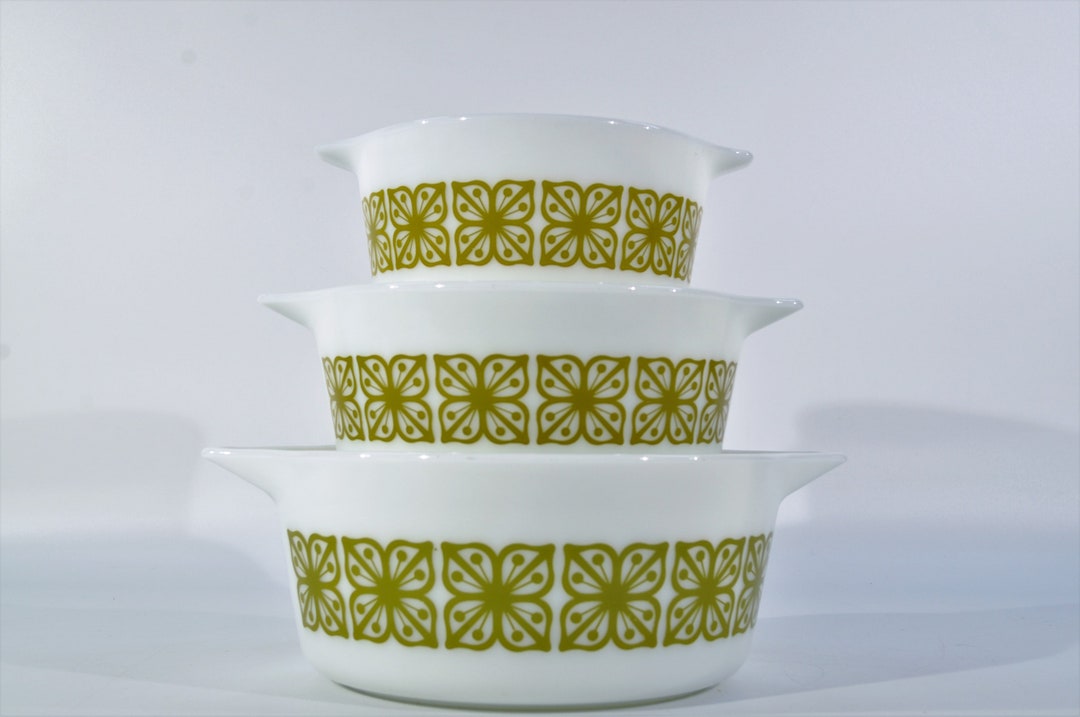Vintage Pyrex 1960's Verde 3 Pc. Round Casserole Set W/lids Pyrex 473 ...