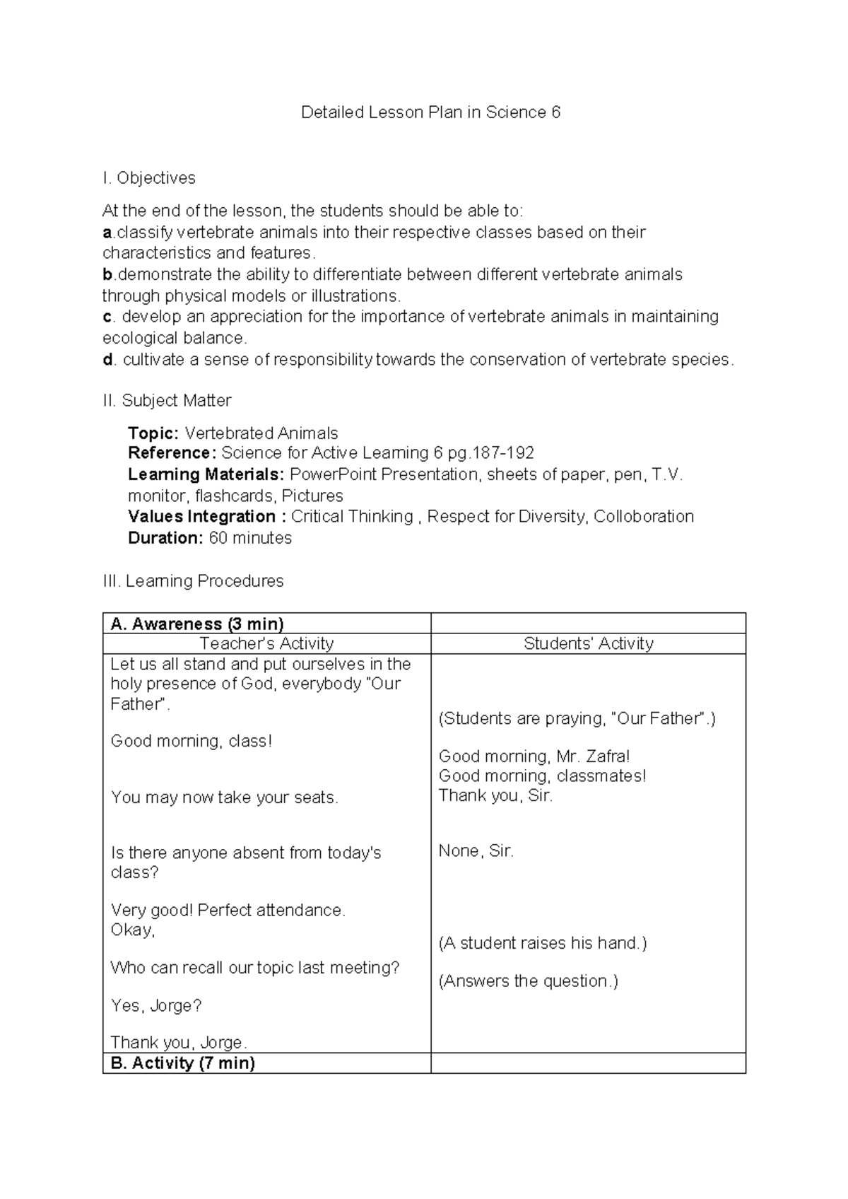 Detailed Lesson Plan - Science 6: Characteristics of Vertebrates - Studocu