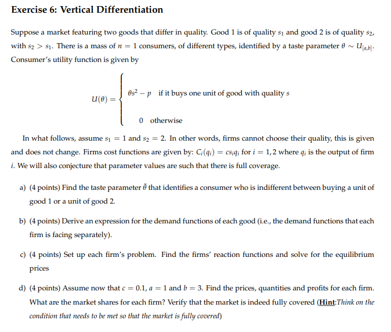 Exercise 6: Vertical Differentiation Suppose a market | Chegg.com