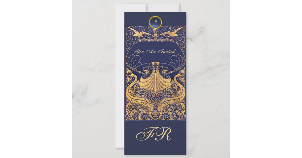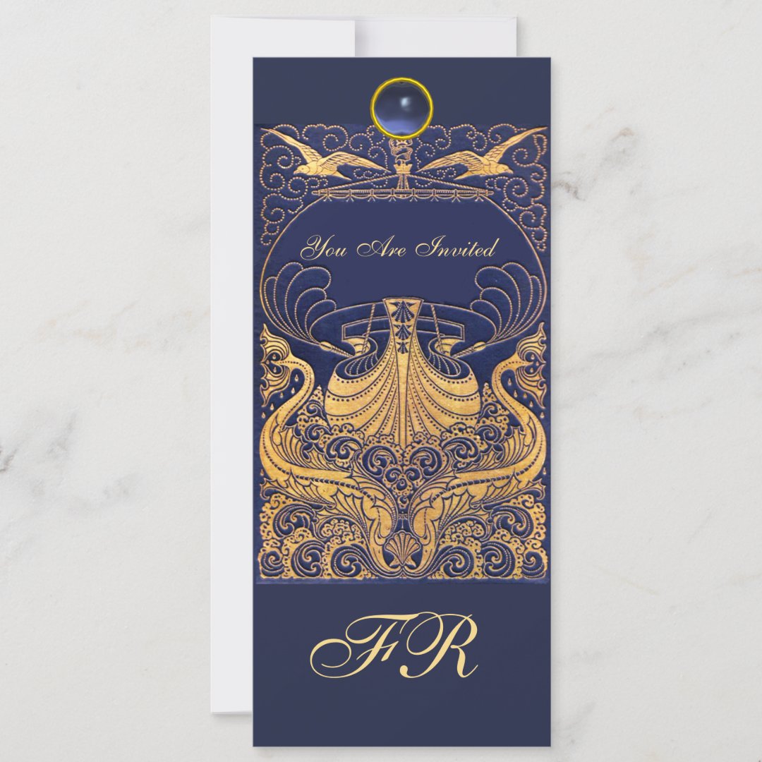 Antique Vessel,Dolphins,Yellow,Navy Blue Monogram Invitation | Zazzle