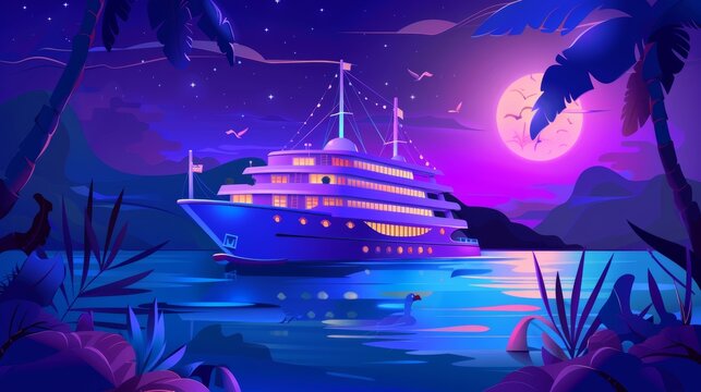Night cruise on sea liner cartoon flyer, invitation for booking ticket ...