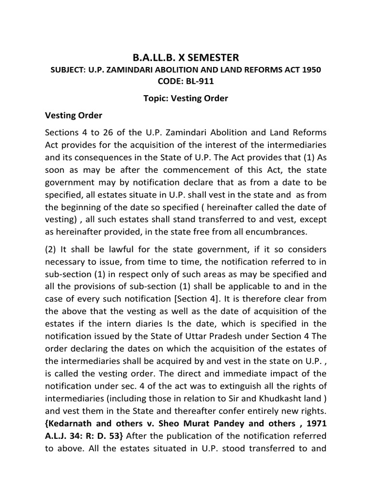 B.A.Ll.B. X Semester: CODE: BL-911 Topic: Vesting Order Vesting Order ...