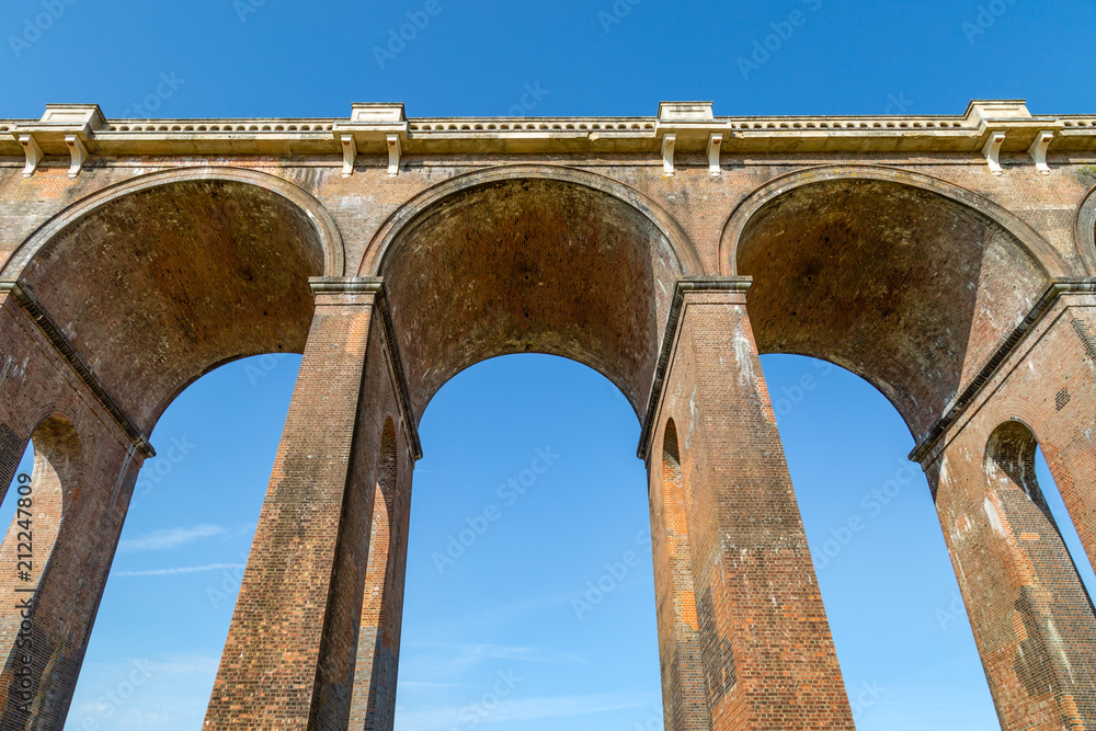 Looking up at the arches of the Ouse Valley Viaduct with a blue sky ...