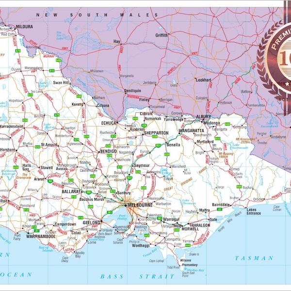 Victoria (Australia) Regions Map with Towns and Roads Highlighted