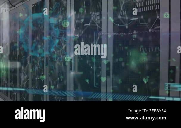 Animation of virus, binary code and connections over servers. Computers ...