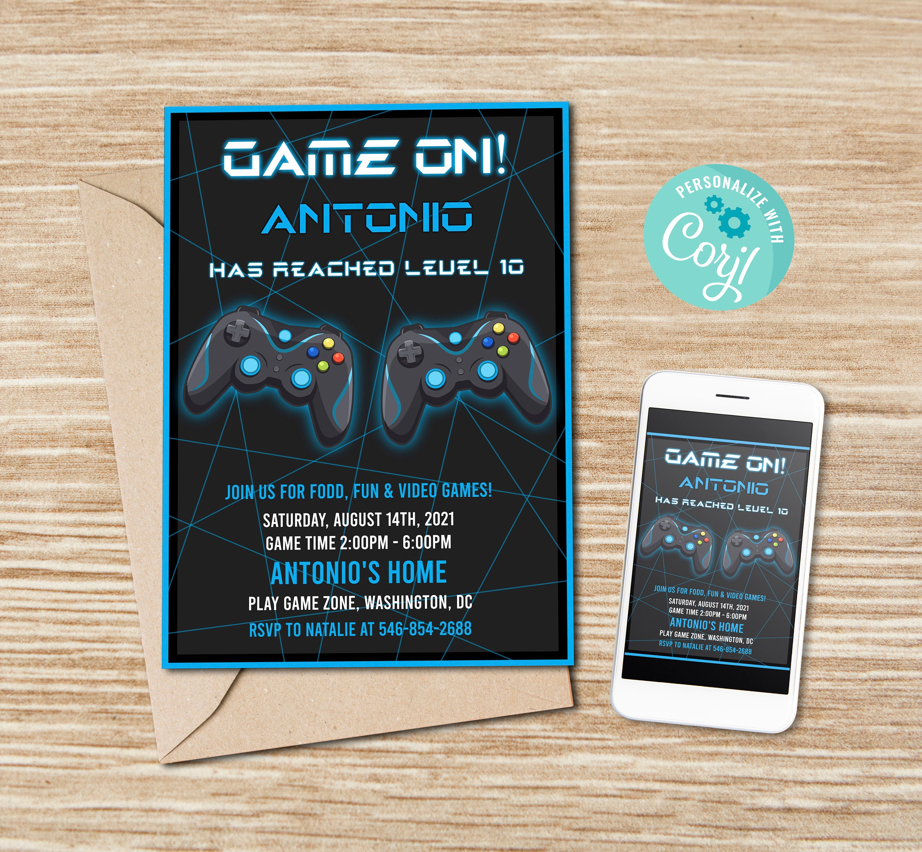 EDITABLE Video Game Party Invitation, Gamer Birthday Invite, Blue Glow ...