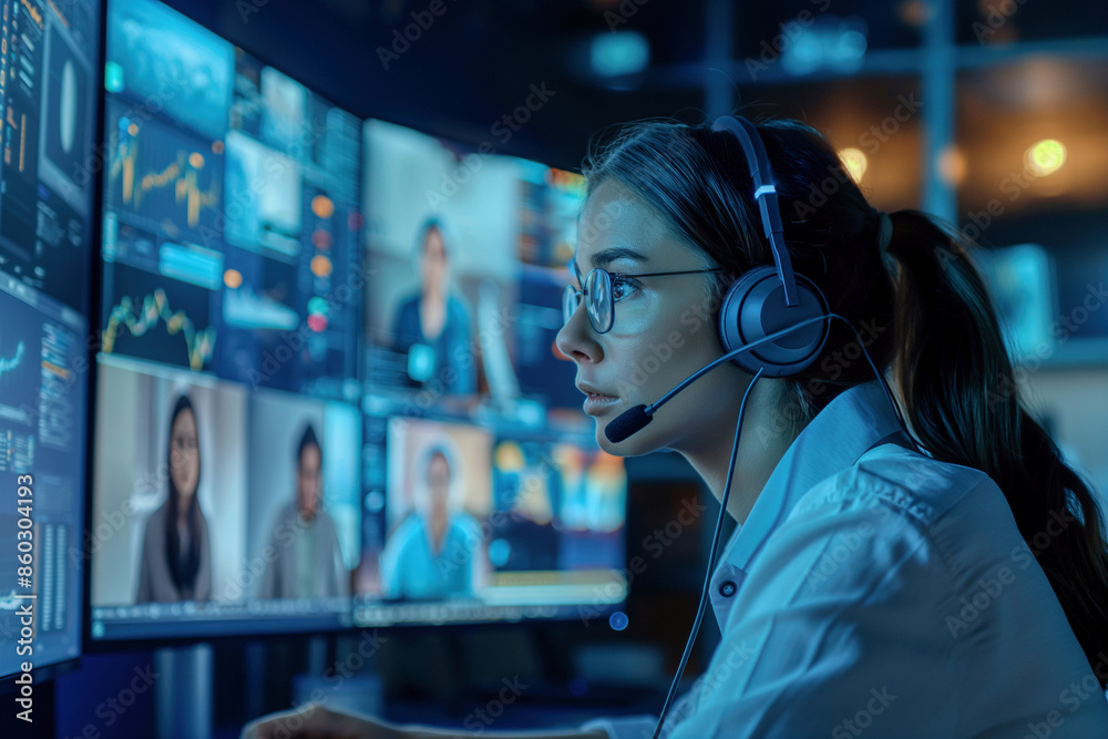 Virtual Video Conference On Multiple Monitor Screens In Office Stock ...