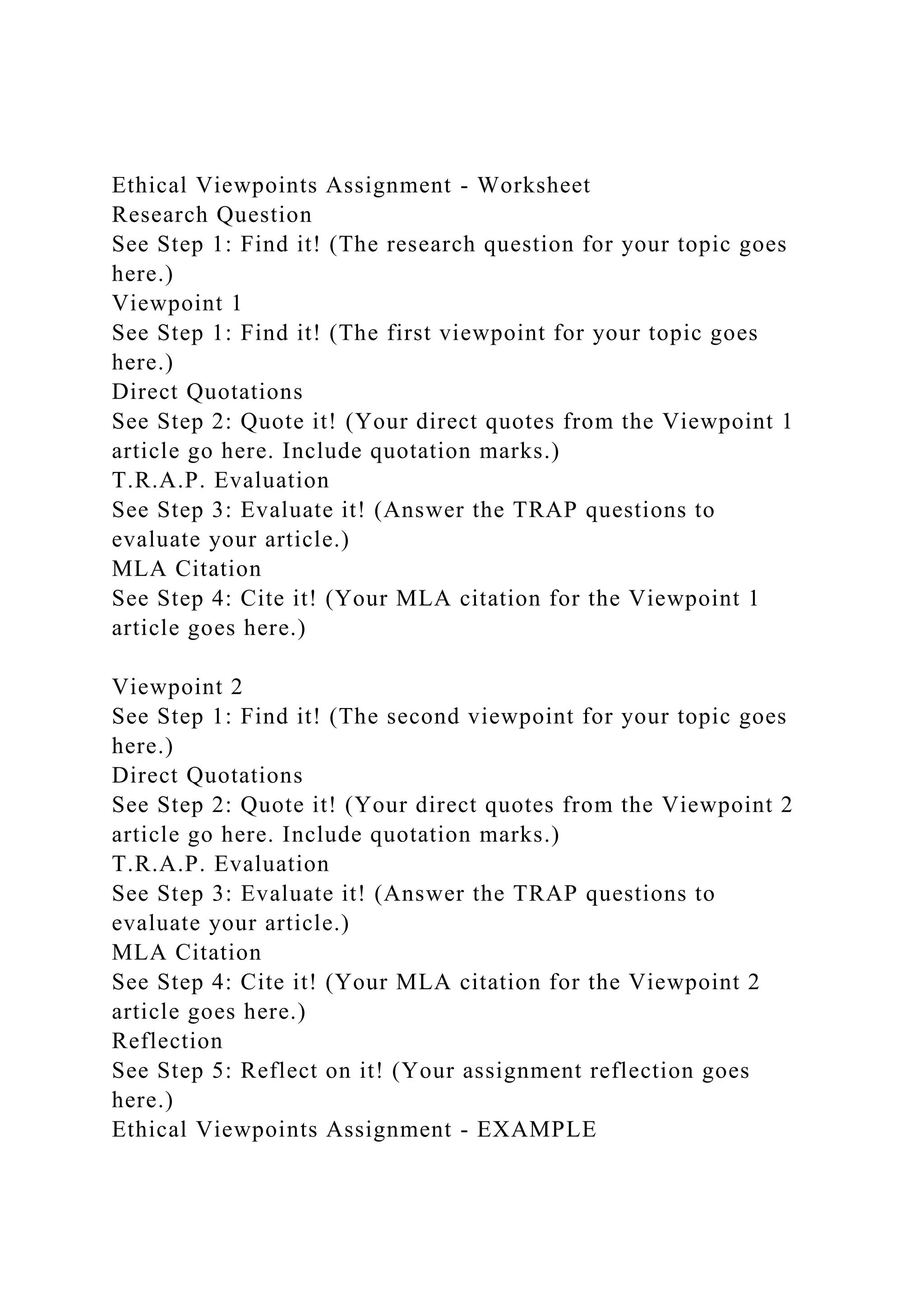 Ethical Viewpoints Assignment - WorksheetResearch QuestionSee .docx