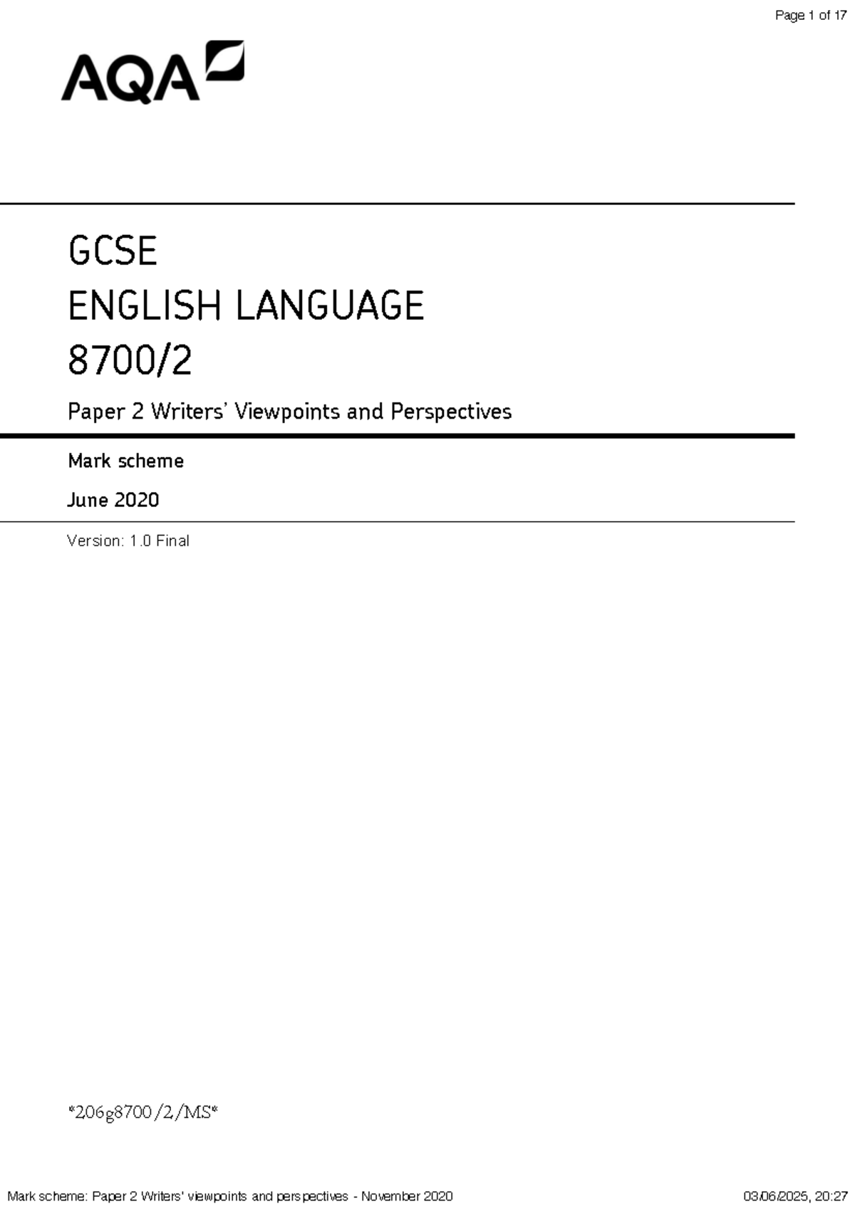 Mark Scheme: GCSE English Language Paper 2 - Viewpoints & Perspectives ...