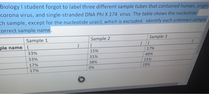 Solved sample 1 is dna vir sample 2 rna vir am i in | Chegg.com