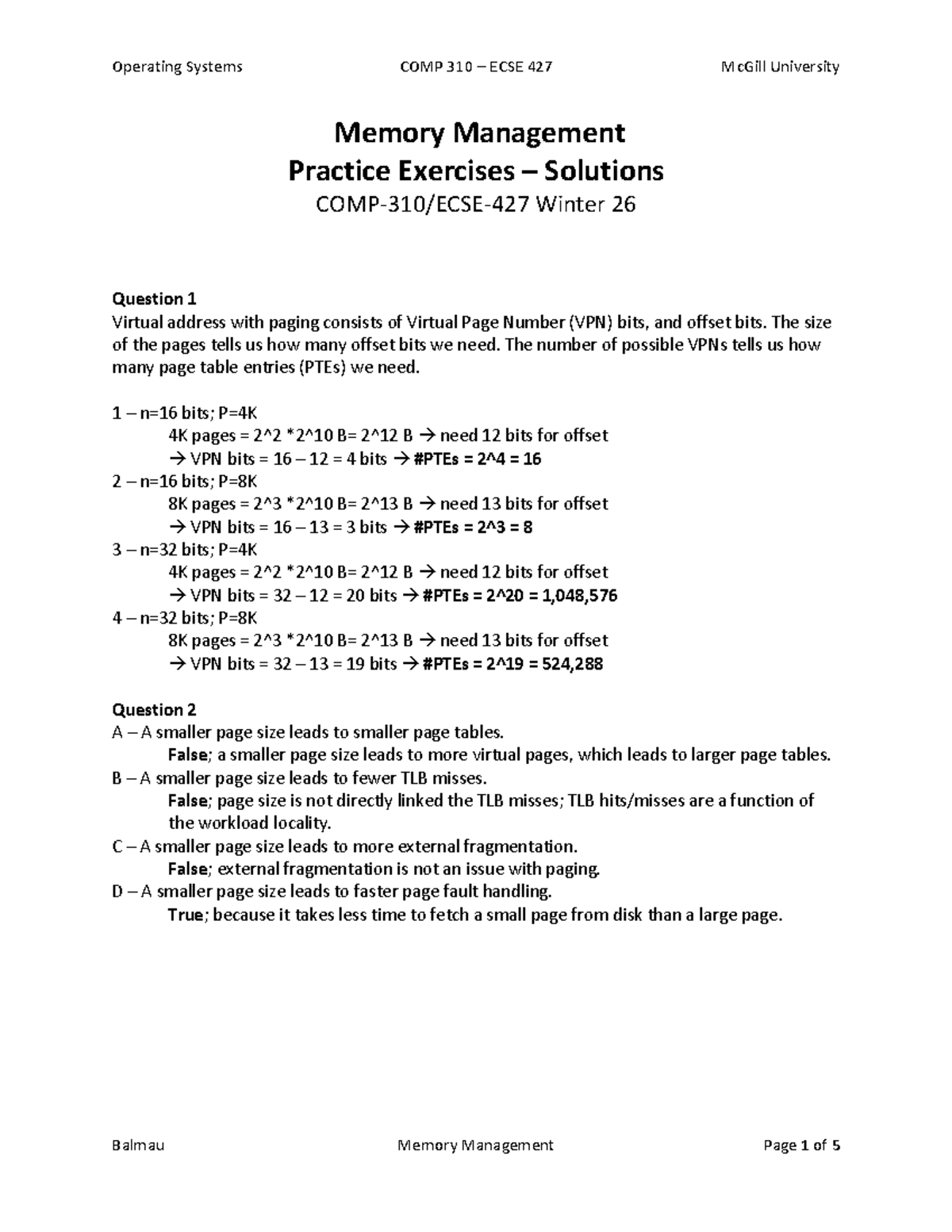 Memory Management Solutions COMP 310 ECSE 427 Winter 26 - Studocu